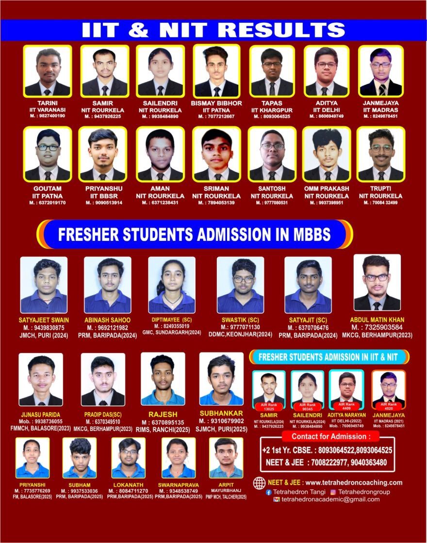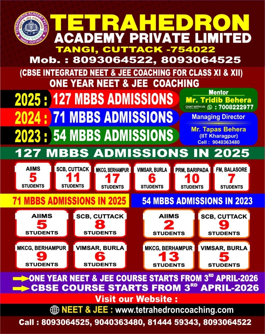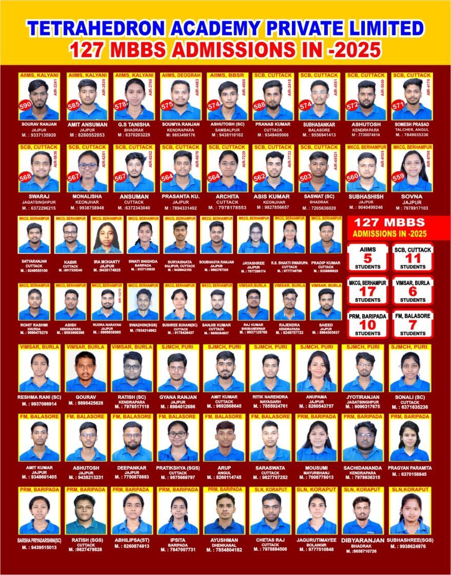 Tetrahedron Academy is the sister company of Tetrahedron Group of Institutions, one of the largest residential Science Colleges ( 11 & 12) of Odisha. Tetrahedron Academy is the specialized wing of Tetrahedron Group of Institutions, which focuses primarily on NEET and JEE coaching. In the year 2024, 71 students secured very good marks in NEET exam and got admission in AIIMS and state Government medical colleges. Tetrahedron Academy is the pioneer organization in Odisha to enter into e-learning Platform from the year 2026. Tetrahedron Academy is developing an e-learning App for Odisha state board students of Class 11 and 12 and for NEET & JEE aspirants.